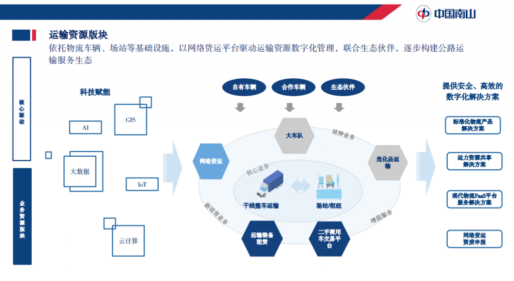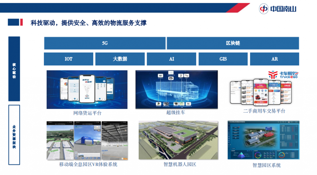 運(yùn)輸資源版塊現(xiàn)有包括網(wǎng)絡(luò)貨運(yùn)、干線整車運(yùn)輸、場(chǎng)站園區(qū)、?;愤\(yùn)輸、二手商用車交易平臺(tái)、運(yùn)輸裝備租賃等業(yè)務(wù)板塊。目前擁有8,000余臺(tái)自有車輛,6萬(wàn)余臺(tái)長(zhǎng)期合作車輛,運(yùn)輸線路超過(guò)1,000條,是全國(guó)規(guī)模最大的自營(yíng)車隊(duì)。該板塊的核心企業(yè)“赤灣東方”更是被評(píng)為中國(guó)5A級(jí)物流企業(yè)和全國(guó)五星級(jí)大車隊(duì),是國(guó)家多式聯(lián)運(yùn)示范工程項(xiàng)目牽頭企業(yè),是中國(guó)最大的公路甩掛運(yùn)輸企業(yè)。 物流是技術(shù)應(yīng)用最佳場(chǎng)景,技術(shù)是物流行業(yè)進(jìn)步的重要驅(qū)動(dòng)。除在布局倉(cāng)庫(kù)、運(yùn)輸?shù)然A(chǔ)設(shè)施外,中國(guó)南山集團(tuán)通過(guò)科技驅(qū)動(dòng),大力發(fā)展包括網(wǎng)絡(luò)貨運(yùn)平臺(tái)、超級(jí)掛車、移動(dòng)端全息園區(qū)VR體驗(yàn)系統(tǒng)、智慧機(jī)器人園區(qū)等應(yīng)用為行業(yè)提供提供安全、高效的物流服務(wù)。