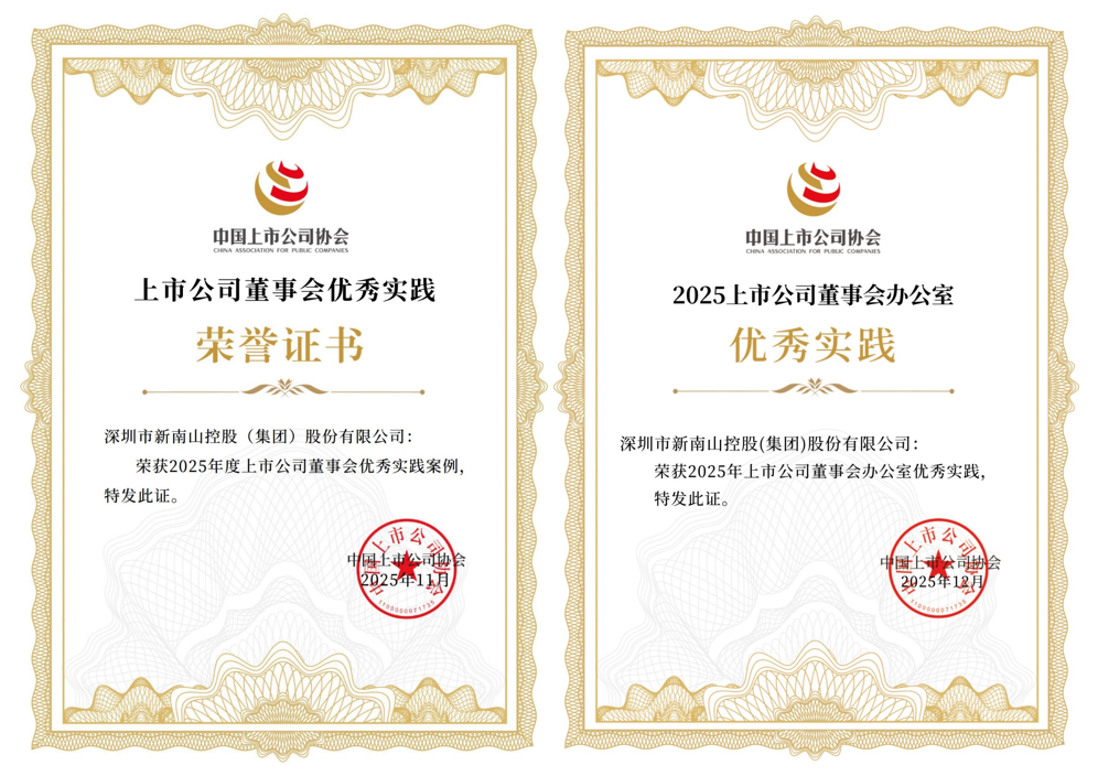 2025.12近日,中國上市公司協(xié)會發(fā)布2025上市公司董事會最佳實踐案例和2025上市公司董事會辦公室最佳實踐的公司榜單,南山控股憑借規(guī)范高效的董事會運作、科學完善的公司治理體系以及嚴謹透明的信披投關(guān)工作,榮獲“2025年度上市公司董事會優(yōu)秀實踐案例”及“2025年度上市公司董事會辦公室優(yōu)秀實踐”兩項榮譽。至此,公司已連續(xù)三年入選該系列榜單。
